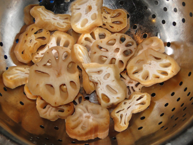Week lotuswortel-stukken (zie foto boven) een uur in heet water.