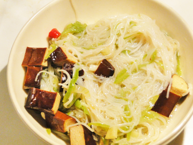 Black tofu, snijbonen, mihoen van zilvervliesrijst
