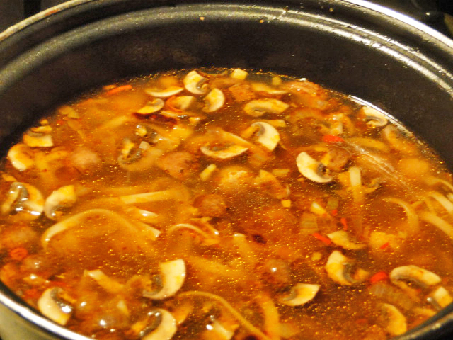 Kookwijn erbij; culinaire hotemetoten gebruiken in zo'n gerecht Shaohsing (Shaoshing of Shaoxing schrijven ze dan), wij gebruiken dat natuurlijk niet want we koken niet West-Chinees, wij gebruiken Mijiu uit Szechuan