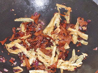 Spaghetti met gekookte hamblokjes en shiitake, geflambeerd met peket (zie hier)