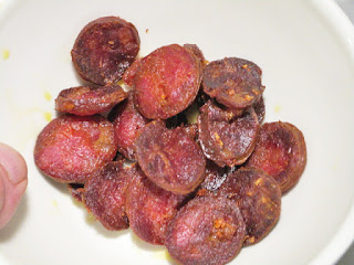 Die chorizo fijngesneden erbij, en wijn? bouillon? en stoven maar